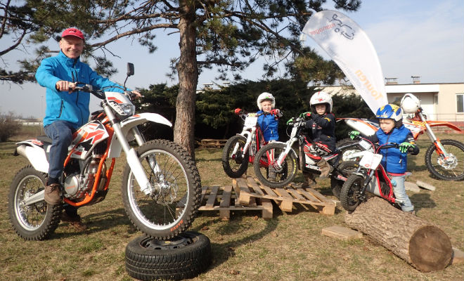 Während die Eltern auf KTM EXCs und Freerides querfeldein durch das Weinviertel fahren, trainieren die Kinder auf E-Trials die richtige Fahrtechnik.