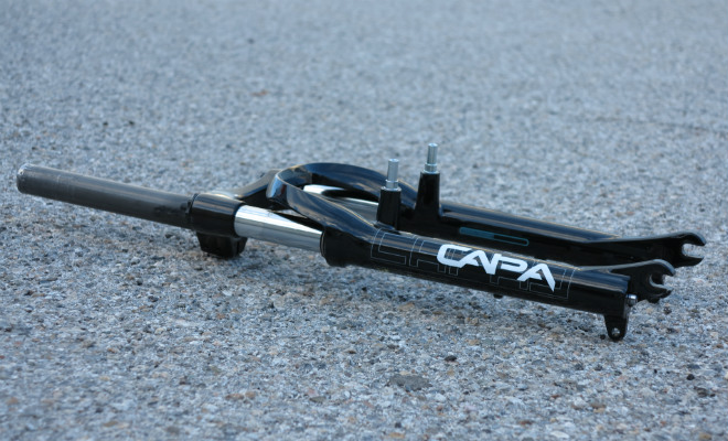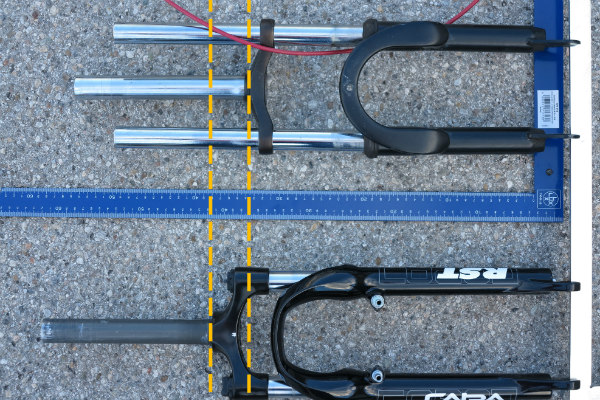 Achtung beim Kauf der Gabel, die gleichnamige RST Capa mit 50 mm Federweg aus dem Fahrradhandel hat eine viel zu lange Einbaulänge, zudem müssen der Schaft erst eingepresst und die beiden Aufnehmer für die V-Bremse abgesägt werden: